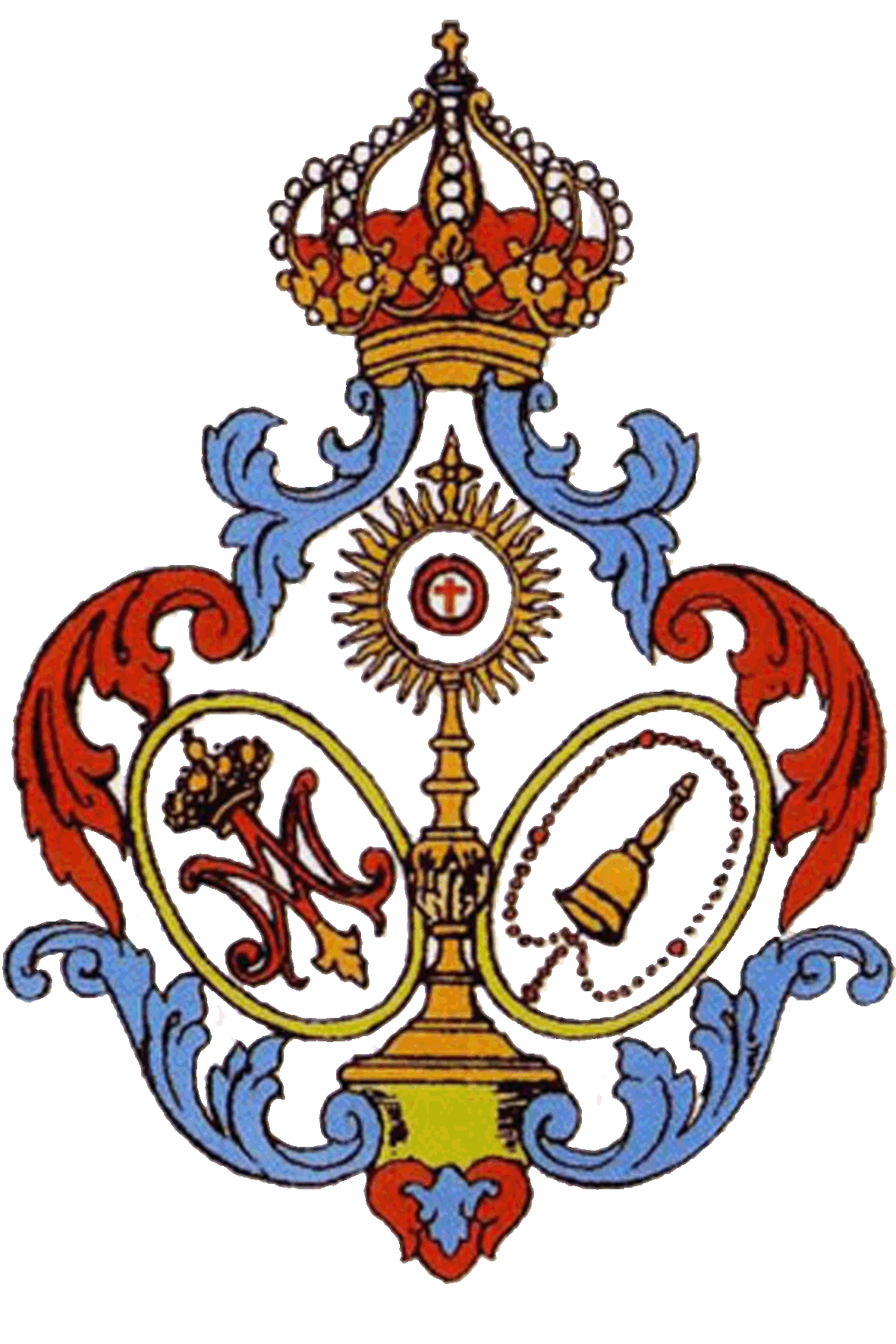 El escudo heráldico de la Hermandad está compuesto por Custodia en la parte central del mismo flanqueada por dos óvalos inclinados hacia el exterior. En el de la derecha figura La Esquila rodeada del Santo Rosario y en el de la izquierda el anagrama del Ave María coronada en su parte superior. Todo el conjunto se remata con corona real.